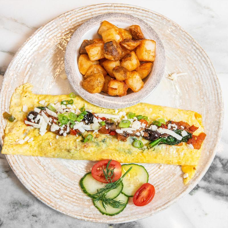 No Substitutions. All omelets are made with three extra large organic eggs. come with homemade bread and a choice of home fries or fresh fruit.
